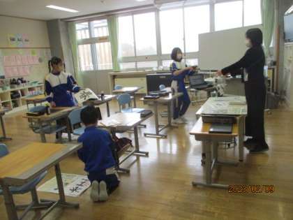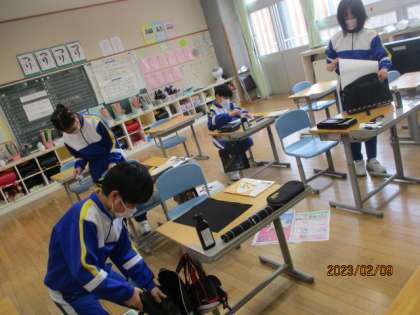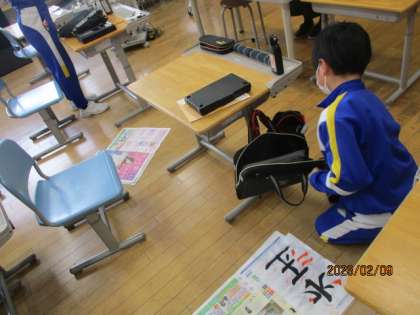 今年度から始まった書写の毛筆を使った学習。3年生は今、その総仕上げと言うべき作品を創作しています。そして、片付けもてきぱきとできるようになりました。新しい4年生に向かって、進んでいます。