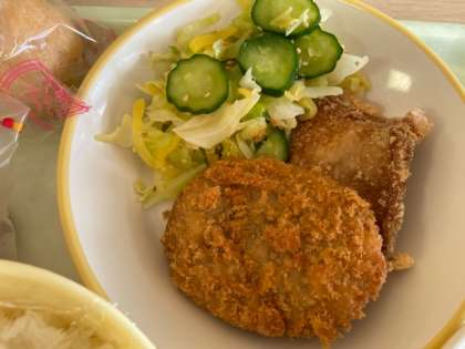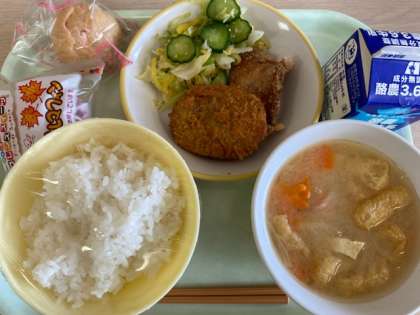 ごはん、豚肉の竜田揚げor肉じゃがコロッケ、あわせ和え、みそ汁、メープルマフィンorいちごのシュークリーム、牛乳です。