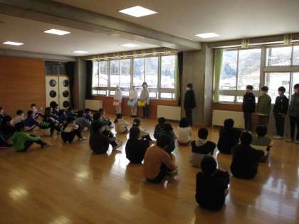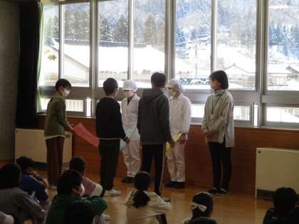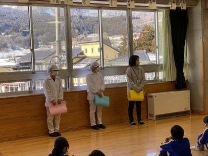 「調理員さんに感謝を伝えよう集会」で毎日美味しい給食の献立を考えたり、作ったりしてくださっている、調理員さんの見角さんと鍋山さん、栄養教諭の米田先生にメッセージカードと一緒にありがとうの気持ちを伝えました。