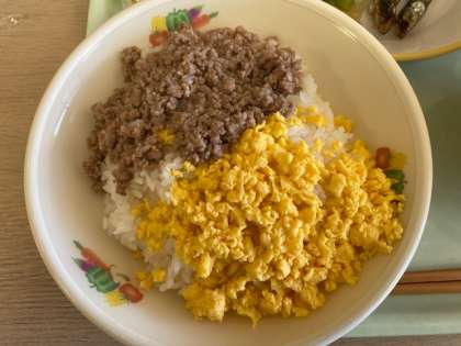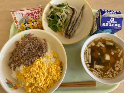 今日の献立は、そぼろ丼(豚そぼろ、炒り卵)菜花ひたし、ししゃも、すまし汁、ひなあられ、牛乳です。