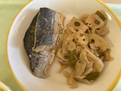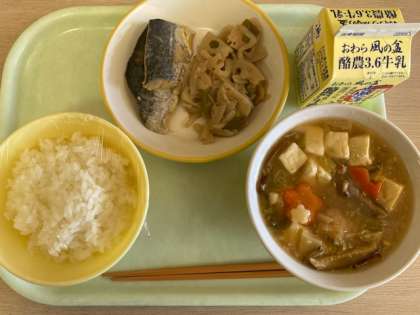 今日の献立は、ごはん、さばの西京焼き、れんこんのきんぴら、えびと豆腐のうま煮、牛乳です。えびと豆腐のうま煮には、具材を型抜きした花びらがたくさんありきれいです。えびがぷりぷりしていておいしいです!