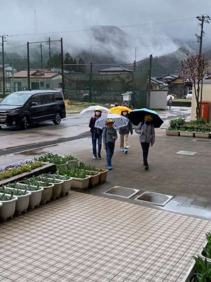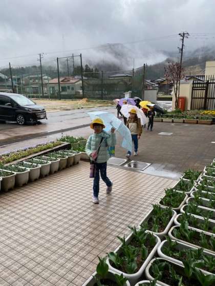 子供たちは、傘を差しながらも元気に登校してきました。