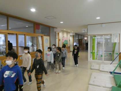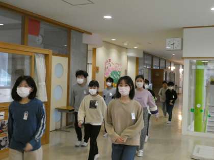 修了式に臨む1〜5年生が、多目的室に入場しました。