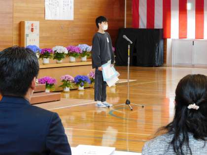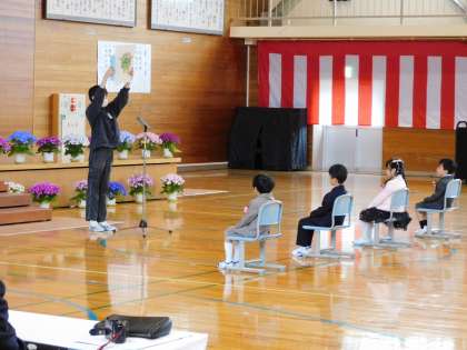6年生のお祝いの話をじっと聴いている1年生です。小学校のみんなは、1年生の入学ををわくわくした気持ちで待っていました。