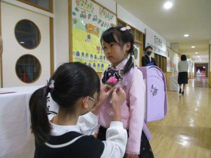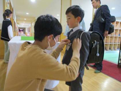 受付で6年生に名札を付けてもらい、教室へ入ります。