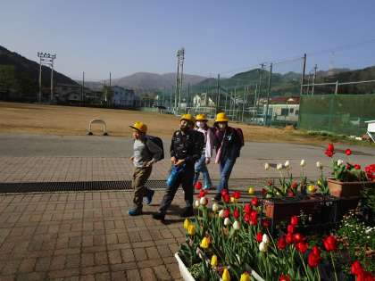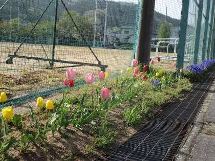 グラウンド脇の道路沿いに植えたチューリップもきれいに咲いています。