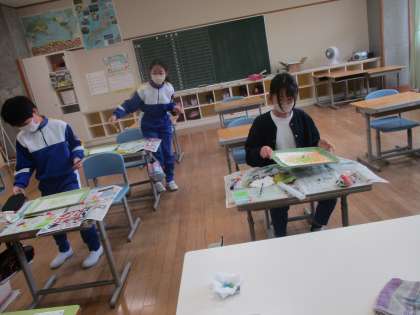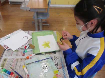 今年度初の作品に取り組み始めた4年生。ビー玉や網、歯ブラシ、片面段ボール等、筆以外の物も使っていろいろな「もよう」ができるのを楽しみました。