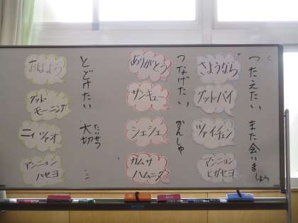 英語、韓国語、中国語の「おはよう」「ありがとう」「さようなら」がでてきます。