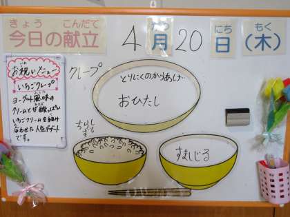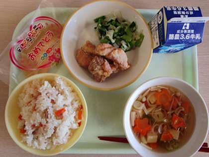 4月20日(木)今日の給食 公開日 2023/04/20 更新日 2023/04/20 職員室より 今日の献立は、ちらし寿司、鶏肉のから揚げ、おひたし、すまし汁、お祝いデザート、牛乳です。 今日は、入学・進級お祝い献立です。