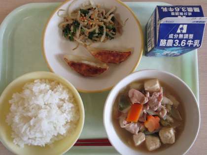 今日の献立は、ごはん、焼きぎょうざ、いり大豆和え、肉豆腐、牛乳です。