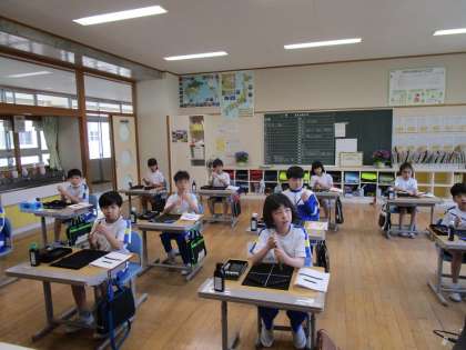 4月27日(木)3年生 書写 公開日 2023/04/27 更新日 2023/04/27 3年生の部屋 前回は、用具の名前を覚えたり、用意の仕方や片付け方だけを学習しました。 今日は初めて墨液を使って半紙に書くので、それを楽しみにしていた子供たち。張り切って準備をしていました。 写真は、動画を見ながら筆をおろしているところです。