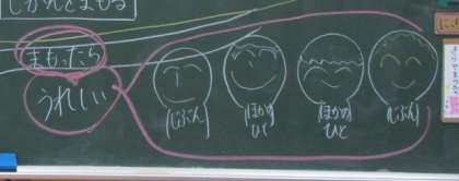 今日の2時間目の道徳科できまりについて学習しました。子供たちは、きまりを守らないと自分も他の人も困ったり、悲しい気持ちになったりするけれど、きまりを守るとみんながうれしい気持ちになると話していました。きまりを守ったときの顔を担任が描こうとすると、「描きたい!」という声があがりました。写真の通り、きまりを守るとみんながにこにこになれるのですね。