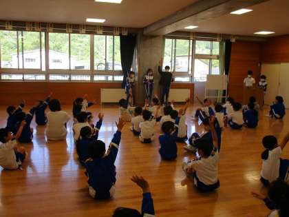 自在ぼうきやモップ、雑巾の使い方をクイズ形式で楽しく確認しました。