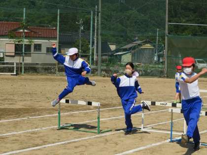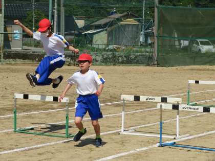 今日は、ハードルの高さを上げ、4コースを設定して練習を始めました。最初は「高くてこわい。」といっていた子供たちも、次第に跳べるようになっていきました。