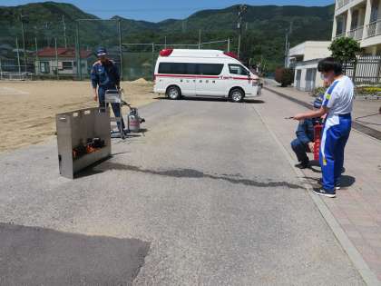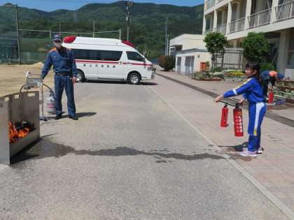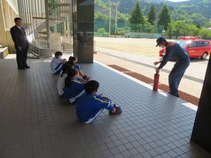 火事を発見したときは、周りに大声で知らせてから消火器の操作をします。6人全員がしっかりと消火をすることができました。