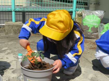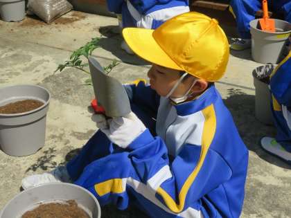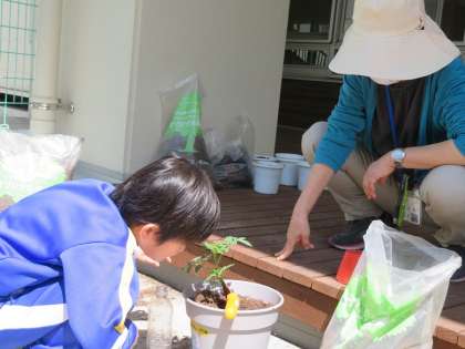 土を入れた鉢に、優しく苗を植えていきます。おいしいミニトマトはいつできるのかな?