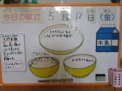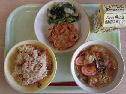 今日の献立は、富富富の五目ご飯、白エビのかき揚げ、とろろ昆布和え、大門素麺汁、牛乳です。