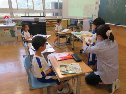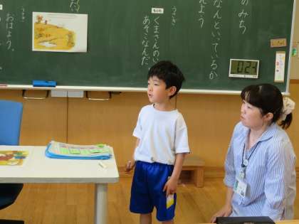 くまさんが見付けた袋の中に入っていた花の種。友達のりすさんに聞きに行ったとき、袋が破れていてこぼれてしまいます。でも、春になって花の一本道ができるという話「はなのみち」。1年生は、今、挿絵を手がかりにして話し合いながら、物語の世界に浸っています。