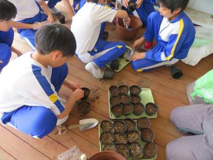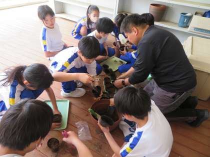 4.5年生は、BFCの活動の一環として、ひまわりの種をポットで育て始めました。