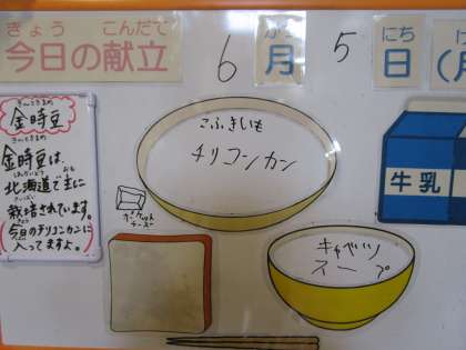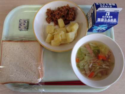 今日の献立は、食パン、牛乳、チリコンカン、こふきいも、キャベツスープ、ポケットチーズです。