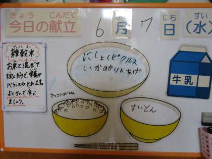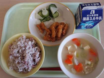 今日の献立は、雑穀いりごはん、牛乳、いかのかりんあげ、2色ピクルス、すいとんです。