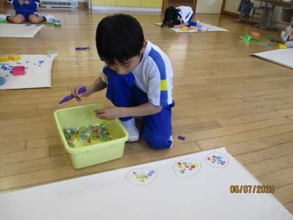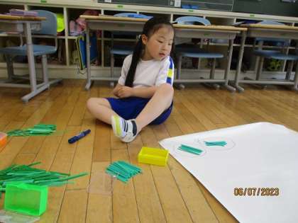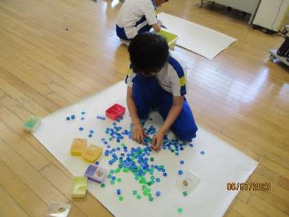 「100より大きい数を調べよう」の学習で、遊び用のおはじき、算数セットのおはじき、数え棒の三種類から1つ選び、数えました。