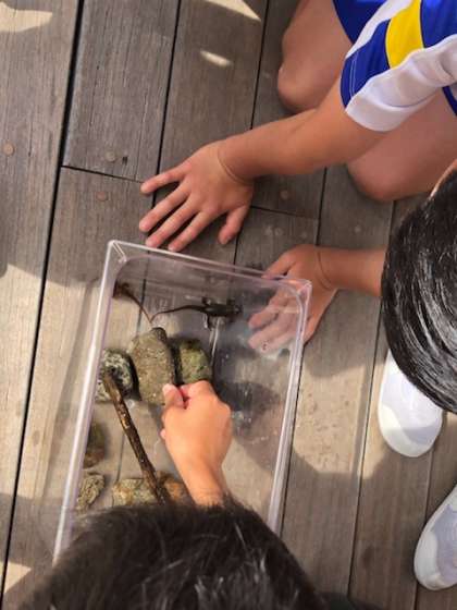 3階のテラスに行くと、3年生がイモリのお世話をしていました。今朝、オスの色が変わっていたそうです。