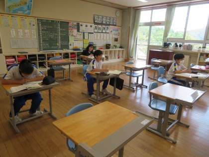 国語「アップとルーズで伝えよう」の要約をしています。説明文の中の大事な言葉を見付け出し、一人一人が真剣に考え、ノートにまとめています。