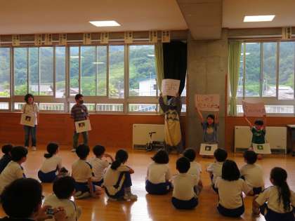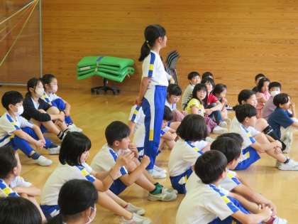 今日の児童集会は、元気健康委員会が企画した「早寝早起き」に関わる内容の集会でした。「早寝早起き」を大切にすることで、体つくりの3つの効果があることを紹介しました。劇のような発表だったので、全員楽しく学ぶことができました。