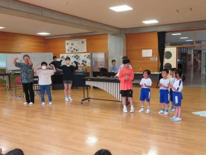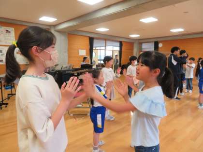 1年生と4年生のカノンから始まりました。1年生が堂々と「むすんでひらいて」を歌い、それに重ねるように、4年生が歌いました。そして、全校児童でパートを分けて大合唱です。