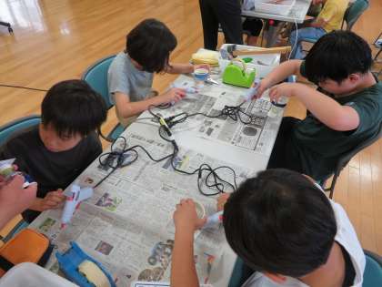 中学年は、「風船ホバークラフト」を作り、床面で動かしてみました。