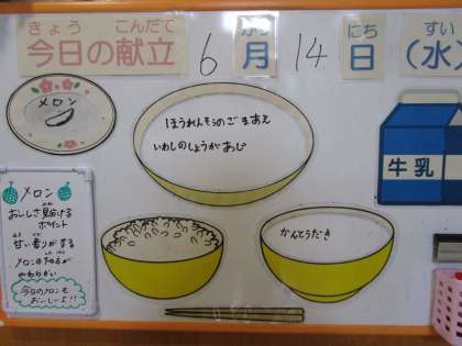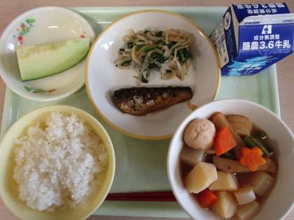 今日の献立は、ごはん、牛乳、いわしの生姜味、ほうれんそうのごま和え、関東炊き、メロンです。