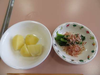 調理を終え、ほうれん草のおひたしとゆで芋ができました。