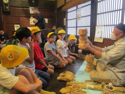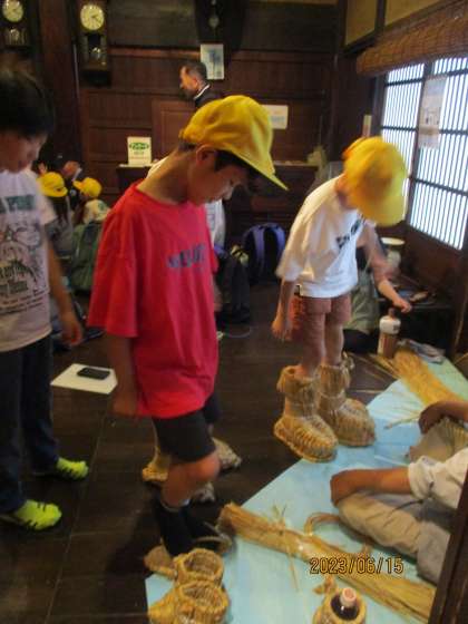 見学だけではなく、わらぐつ体験や石臼体験も行いました。わらぐつを履いた子供たちは「見た目より軽いし、中が暖かい」と驚いた様子でした。石臼でお米をひいた子供たちは「意外と重かった。昔の人は大変だったんだ」と昔の暮らしに思いを馳せていました。