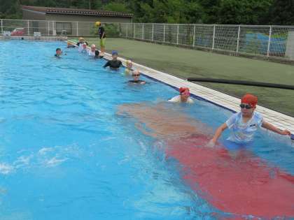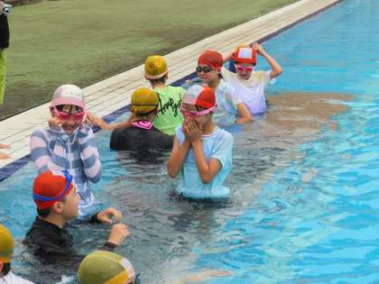 広い大プールに入った上学年。久しぶりの水泳学習にどきどきしています。