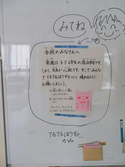 来週に実施する4〜6年生の宿泊学習が晴れるようにと、うれしいメッセージコーナーも加わりました。みんなの願いが届きますように。