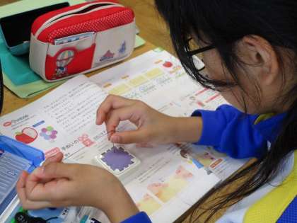 裁縫の学習中です。まずは、糸を適度な長さに切り、針に糸を通すところから。