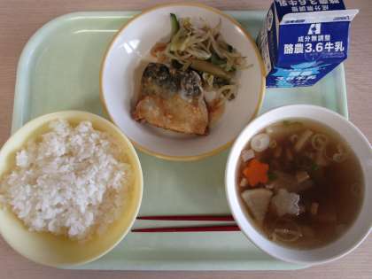 今日の献立は、ごはん、牛乳、魚の梅風味かば焼き、茎わかめの中華和え、根菜スープです。