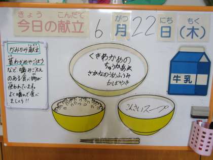 今日は、よくかんで食べよう献立です。かみごたえのある食材は、茎わかめ、ごぼうです。