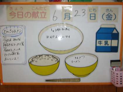 今日の献立は、ごはん、牛乳、にんじんシューマイ、生姜浸し、とんこつラーメンです。