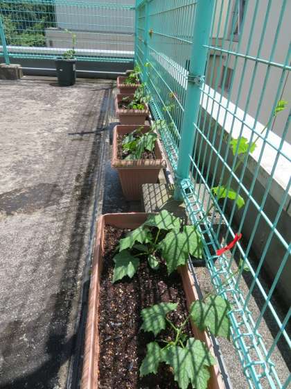 セミが鳴き始め、夏が近づいてきました。4年生が蒔いたヘチマの種が発芽し、勢いよく成長を始めました。