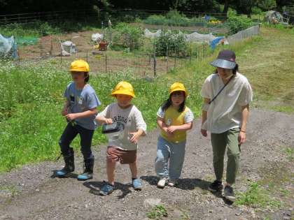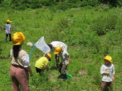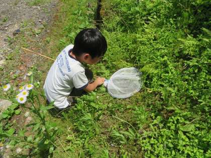 捕虫網でチョウチョを追いかけ捕まえる子、捕まえた虫を観察する子、友達と協力して虫かごに虫を移しかえる子等。暑さも忘れて活動しました。