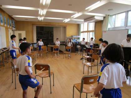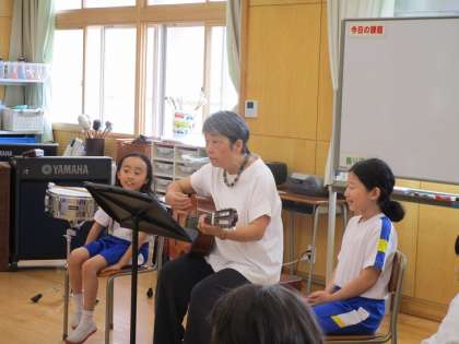 「遠足」という曲を歌いながらリズム伴奏をしていました。歌とリズム打ちを同時にやるのは難しいものです。間違った音程の部分を指摘された後の子供たちの反応が素敵でした。