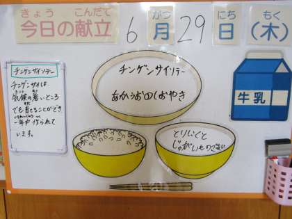 今日の献立は、ごはん、牛乳、赤魚の塩焼き、チンゲンサイソテー、鶏肉とじゃがいもの胡麻煮です。