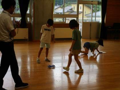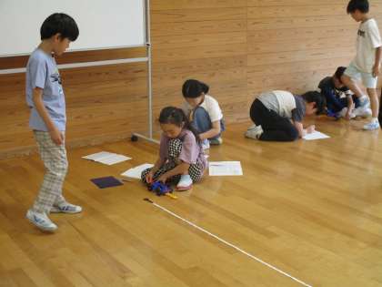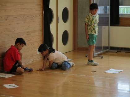 ゴムの伸ばし方を変えると進む距離はどのように変わるかという実験中です。グループの友達と協力して計測していました。
