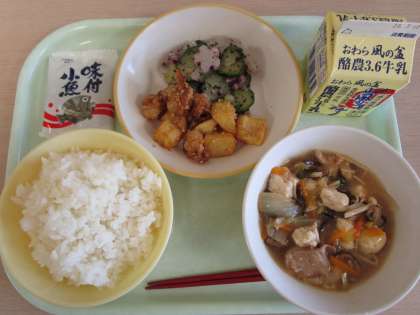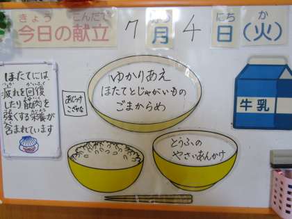 今日の献立は、ごはん、牛乳、ほたてとじゃがいものごまからめ、ゆかりあえ、豆腐の野菜あんかけ、味付小魚です。