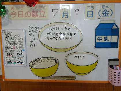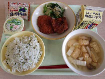 今日の献立は、菜めし、牛乳、豚肉の香味揚げまたは白身魚のフライ、はりはり和え、みそ汁、メロンクリームソーダゼリーまたはブルーベリータルトです。