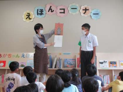 そして、今日は、14歳の挑戦で細入図書館で仕事をしている中学生が読み聞かせやブックトークをしてくれました。
