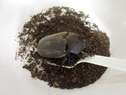 2年生:先生、ちょっと来てください。階段の下にカブトムシのメスらしきものがいます。