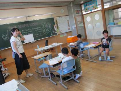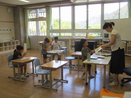 笑顔で元気に登校してきた1年生。始業式が終わると、初めての夏休みの提出物を確かめて出したり、教室に届いた暑中見舞いのお返事をうれしそうに読み合ったりしていました。